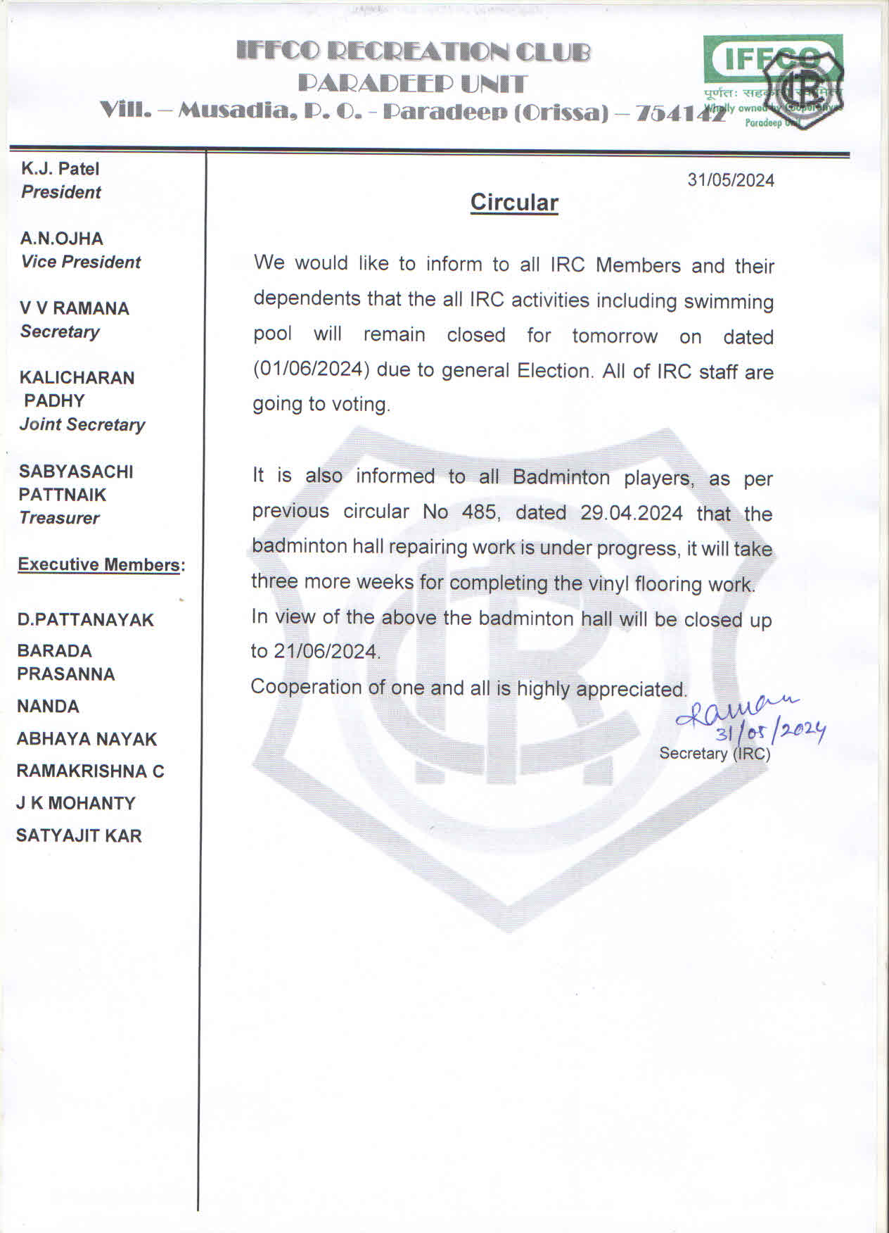 Please refer to the attachment for more details regarding tomorrow's closure and Badminton Hall repair work progress. With Best Regards, -------------------------------- V V Ramana Secretary (IRC) IFFCO Paradeep unit