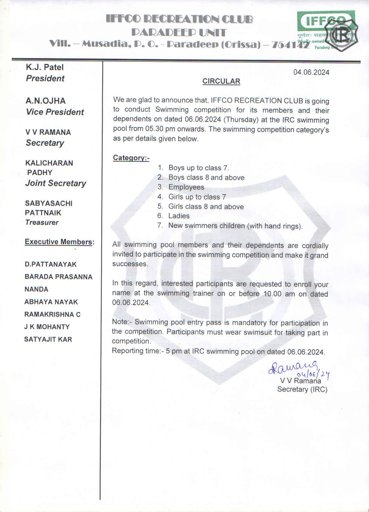 IFFCO RECREATION CLUB is going to conduct swimming competition for its members and their dependents on 06.06.2024 at IRC swimming pool. May please refer to the attachment for more details. Thanking you With best regards ---------------------------- V V Ramana Secretary (IRC) M-8658001531